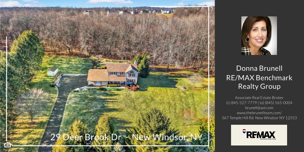 Welcome to 29 Deer Brook Drive, New Windsor — a well-maintained colonial set on 5.2 acres along a quiet road in a desirable location within the Washingtonville Central School District. Built in 1989, this spacious 3-bedroom, 2.5-bath home offers nearly 3,200 square feet of living space, which includes approximately 625ft in the finished basement, perfect for a recreation room, home office, or gym. The first floor offers a spacious eat-in kitchen, formal dining room, cozy sitting area which leads directly into the living room, laundry room and entrance to two car garage. Second floor with all new carpeting includes a generous sized primary bedroom with full bath and large walk-in closet, two additional bedrooms, loft area and full bath. Fully finished basement includes two large open spaces as well as a separate den/office area plus plenty of storage. This home features a classic colonial layout with generous sized rooms, central air, central vacuum, a cozy wood-burning stove in the family room, sliders from kitchen & family room to deck with retractable awning. Step outside to your own private retreat with a saltwater in-ground pool, surrounded by peaceful, wooded acreage—ideal for relaxing, entertaining, or enjoying nature year-round. Located on a private road, this property offers both privacy and convenience, making it a rare find in New Windsor. Despite the private location, this home is just minutes to shopping, dining, major roadways & transportation, offering easy access to everyday amenities while still feeling tucked away. Recent improvements during 2023 include new boiler with 3 separate heating zones and indirect water heater, well tank plus water softener and whole house filter. Pool liner also replaced in 2023. Central air replaced in 2024. A wonderful opportunity to enjoy space, privacy, and comfort - inside and out!!